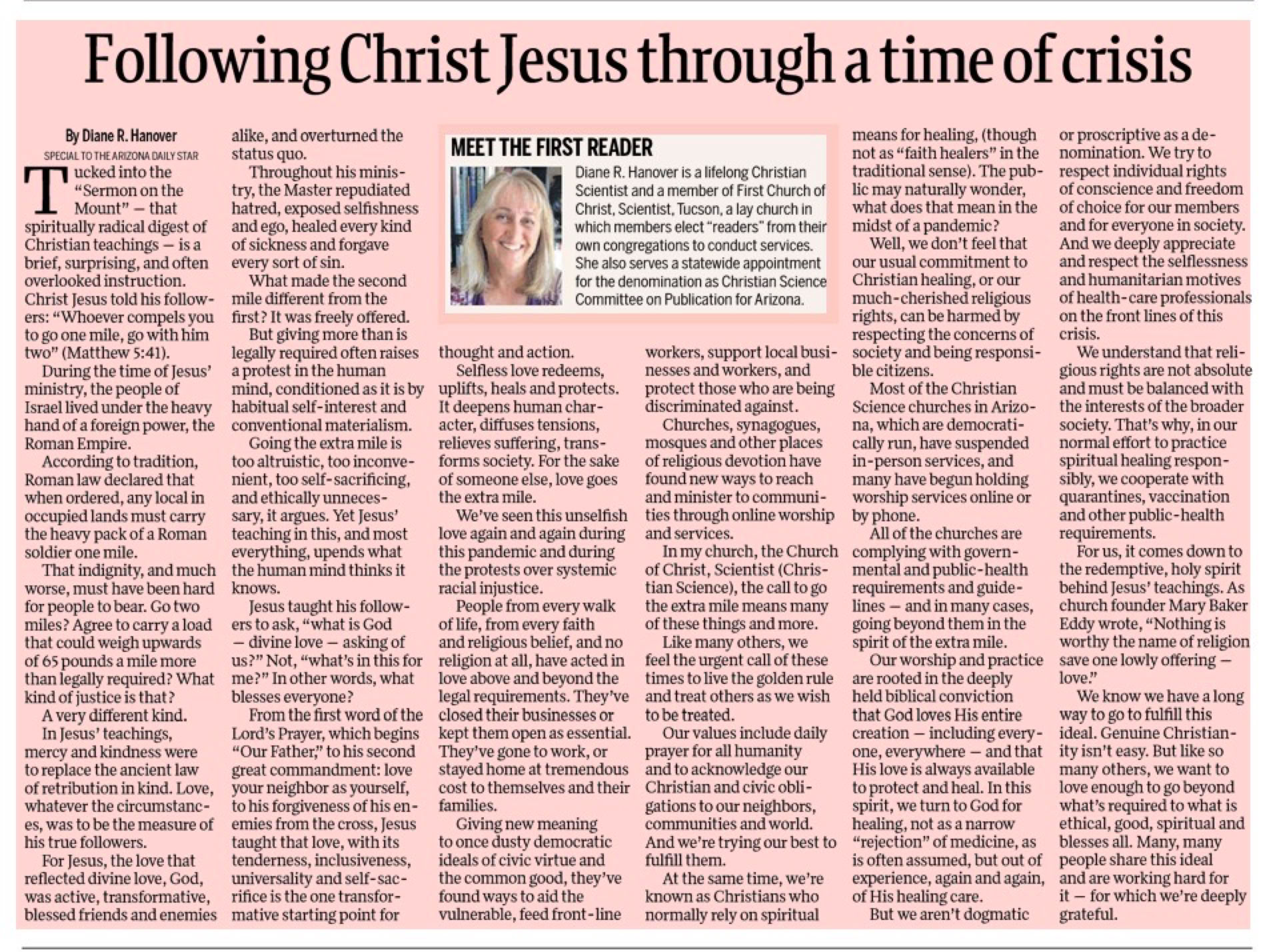 The Christian Science Joint Broadcasting Committee has established a phone number where one can listen to the weekly Christian Science Bible lesson sermons. More information on this can be found at christianscienceaz.com and click on the “broadcasting” link.